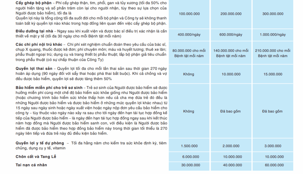 Lưu ý: Thẩm định sức khỏe đầu vào kỹ (có nhiều bệnh nền sẽ không mua được) – Giá mua BH sẽ thay đổi quay từng năm (phụ thuộc chính sách của công ty bh và báo cáo bồi thường năm liền trước của khách hàng)