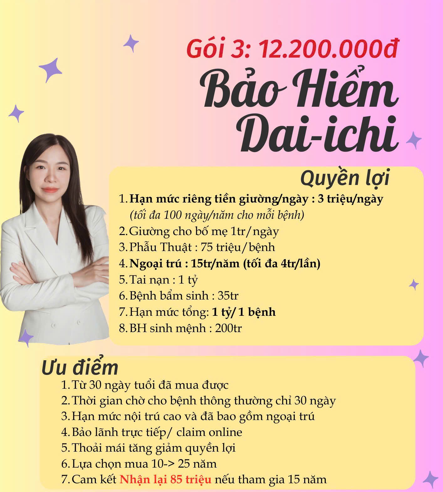 Khi bé lớn hơn → bạn có thể giảm quyền lợi ngoại trú -> gói còn khoảng 8.1 triệu/năm ( bao gồm quỹ tích lũy 5.4tr/năm + nhân thọ + thẻ sức khỏe cao cấp)