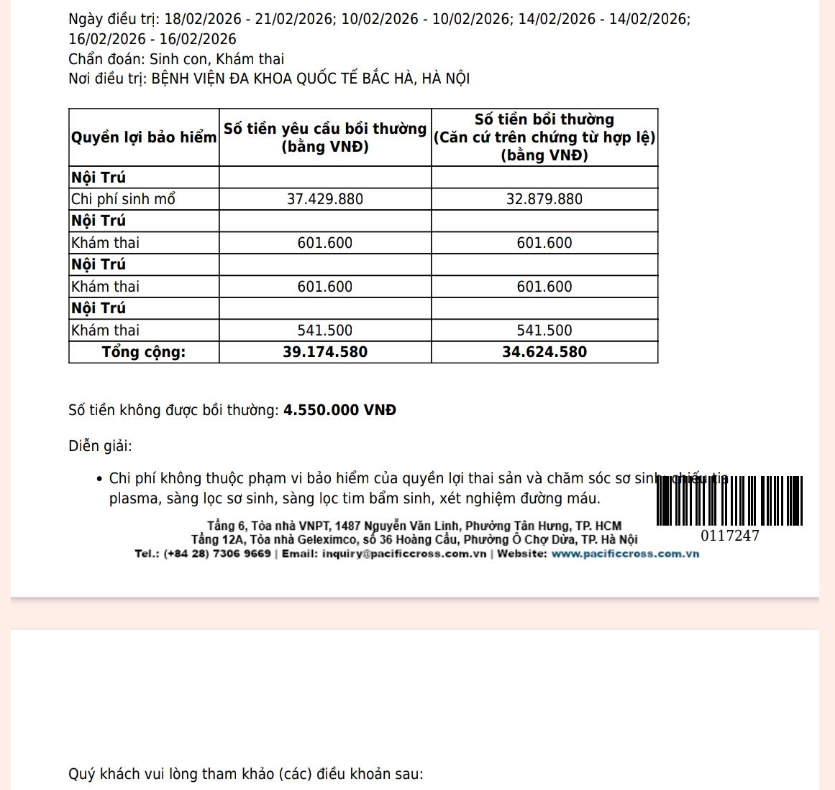 → Bảo hiểm thanh toán: 34.6 triệu đồng - Ngoài ra, nếu khách hàng mua thêm gói trợ cấp tiền mặt, gia đình còn có thể nhận thêm 15 triệu đồng, sử dụng linh hoạt cho các chi phí sau sinh.