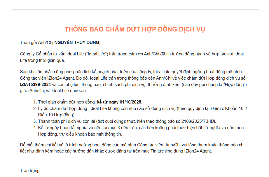 Từ tháng 10/2025, Công ty Cổ phần Tư vấn Ideal Life – đơn vị phân phối độc quyền sản phẩm này – đã chính thức dừng hợp tác với toàn bộ đội ngũ cộng tác viên, bao gồm cả Dung (BDM Level 3 – cấp quản lý cao trong hệ thống Izion24).